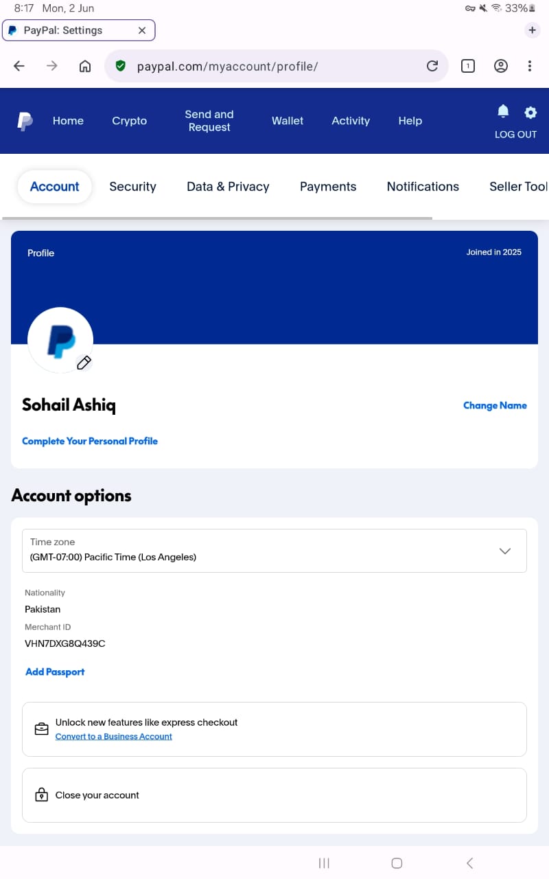 Paypal personal acount order| client name: Sohail ashiq|bussiness name:|date:jun-02-2025|