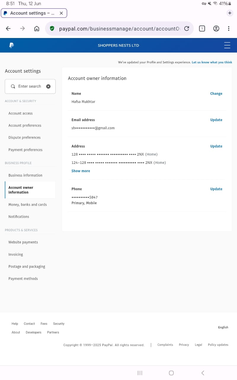 Paypal business account order|client name :hafsa mukhtar| bussiness name :shoppers nest|date:jun-12-2025|